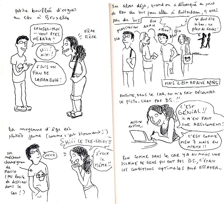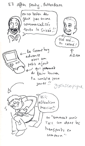 Il y a environ deux semaines, Le journal Spirou me demandait d’aller faire un tour à Rotterdam, à l’occasion d’une soirée organisée par Nintendo : L’E3 after party, en compagnie d’un autre dessinateur, j’ai nommé Adam (le dessinateur de Game Over, série reprenant les personnages des jeux de kid paddle). J’ai donc pris le train pour Bruxelles, afin de rejoindre mon acolyte et le point de rendez-vous du car qui devait nous emmener à la soirée aux Pays-Bas.