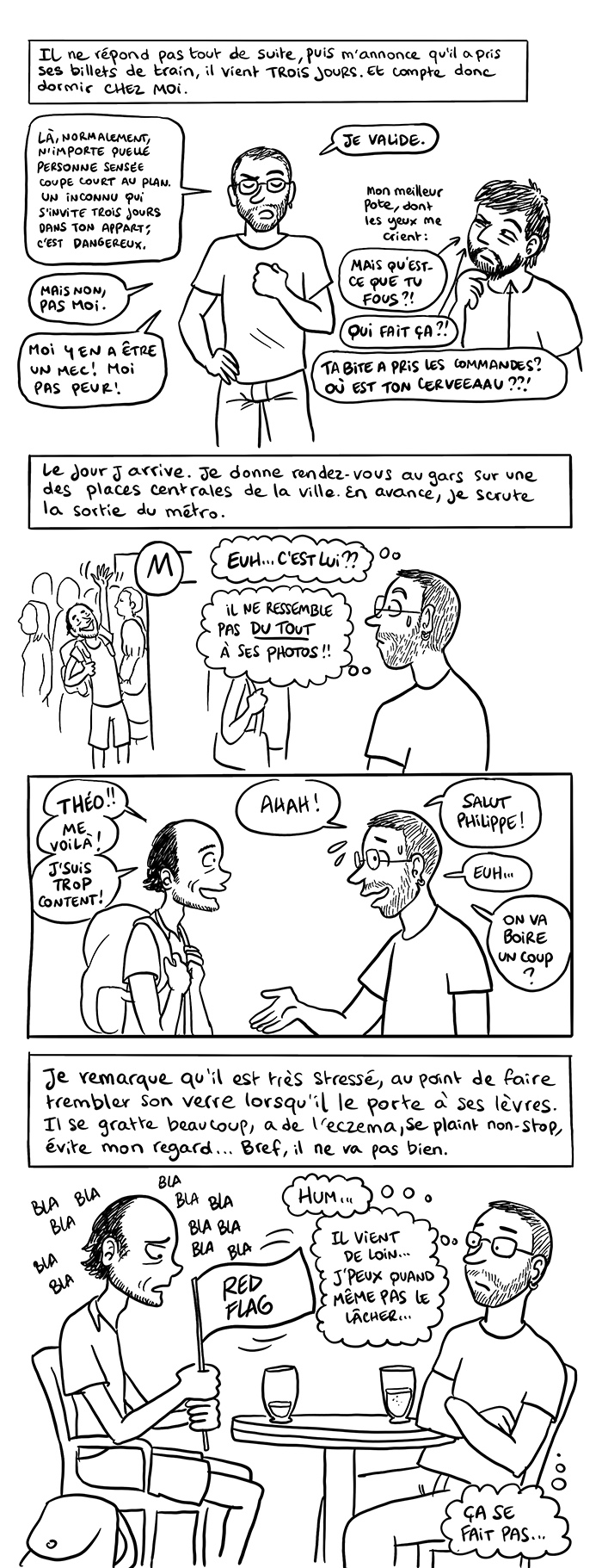 Je vous la pose donc, cette question, à vous, mes habitués de ce blog : Pouvez-vous me raconter votre pire date ? N’hésitez pas à y mettre les formes, à rajouter des détails de contexte, d’ambiance, afin que je puisse rendre la chose le plus fidèlement possible. Mon but n’est évidemment pas de faire dans le shaming, mais de pouvoir mettre en image une diversité d’histoires croustillantes, courtes, longues, mignonnes, malaisantes, drôles, inquiétantes, effarantes, bref de pouvoir toucher du doigt à travers vos anecdotes toute la diversité des rapports entre humains qui se draguent…