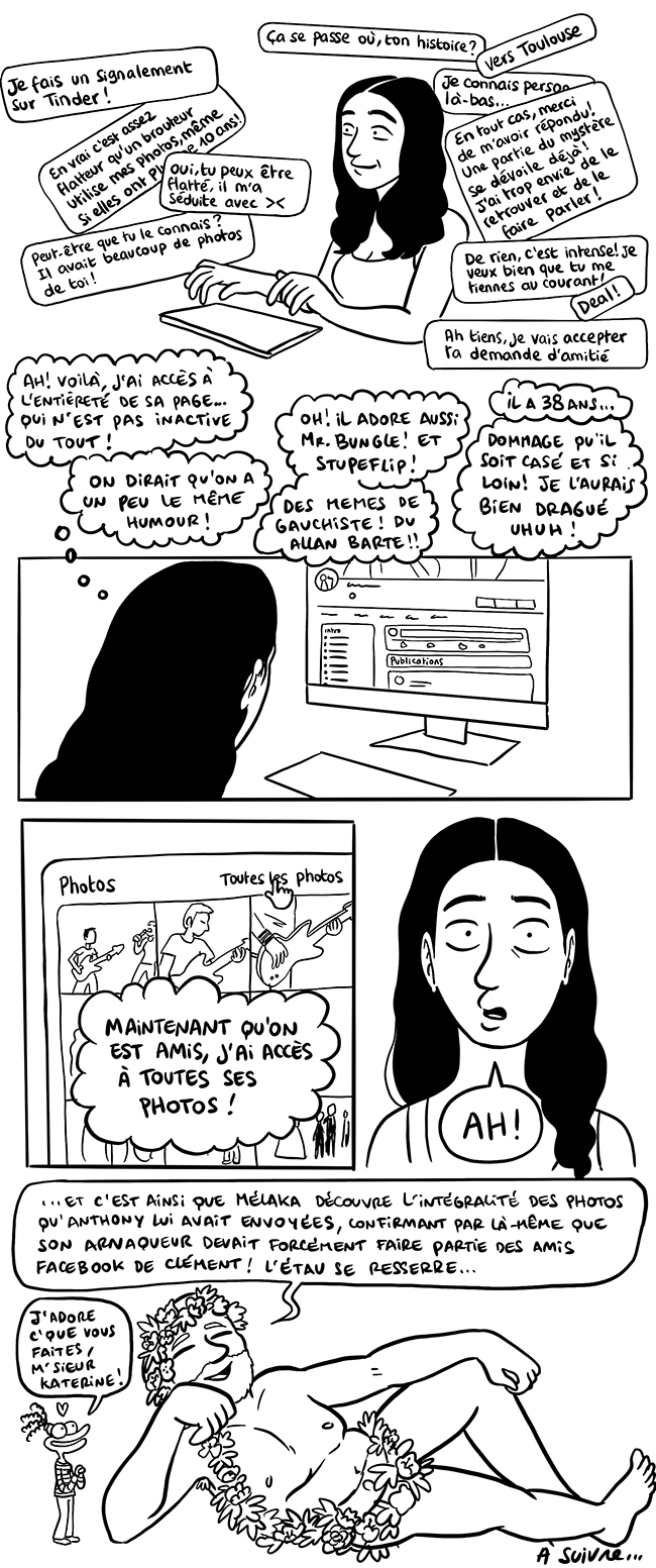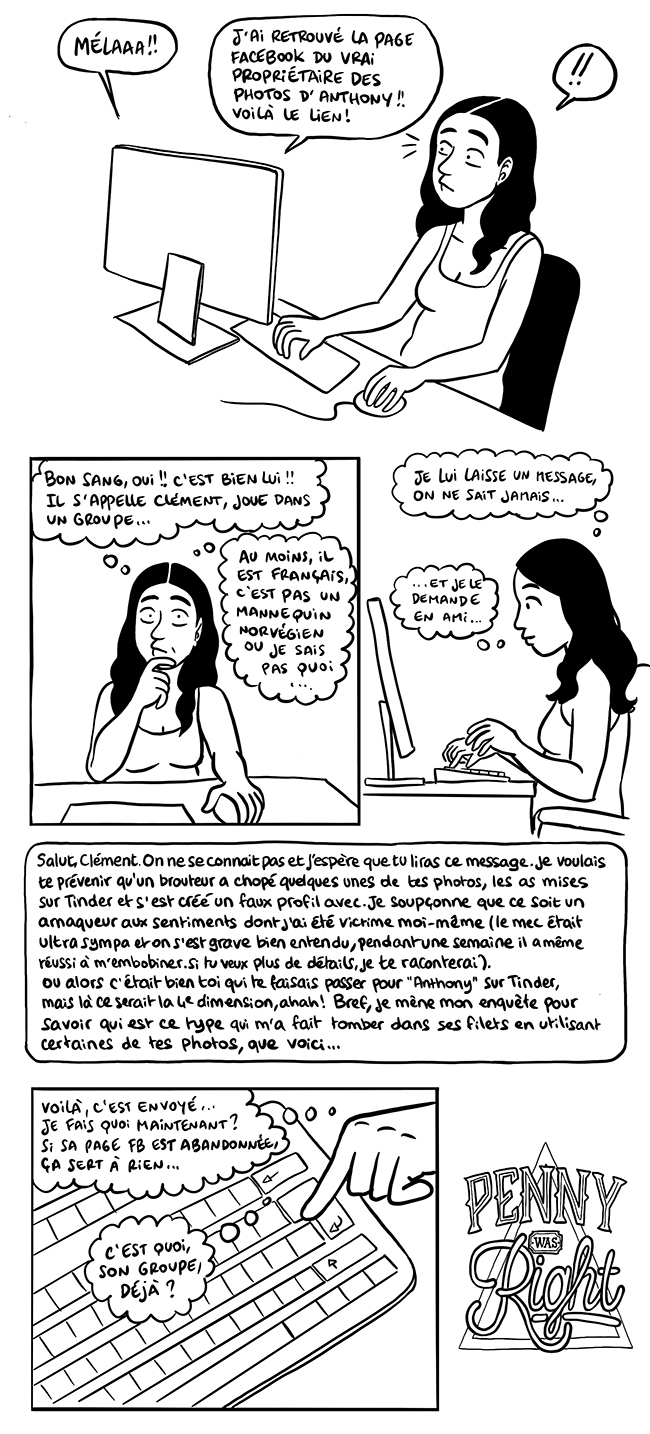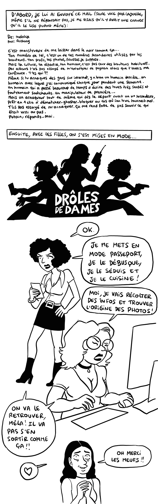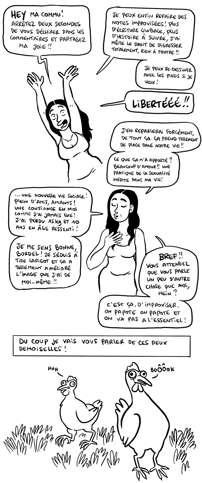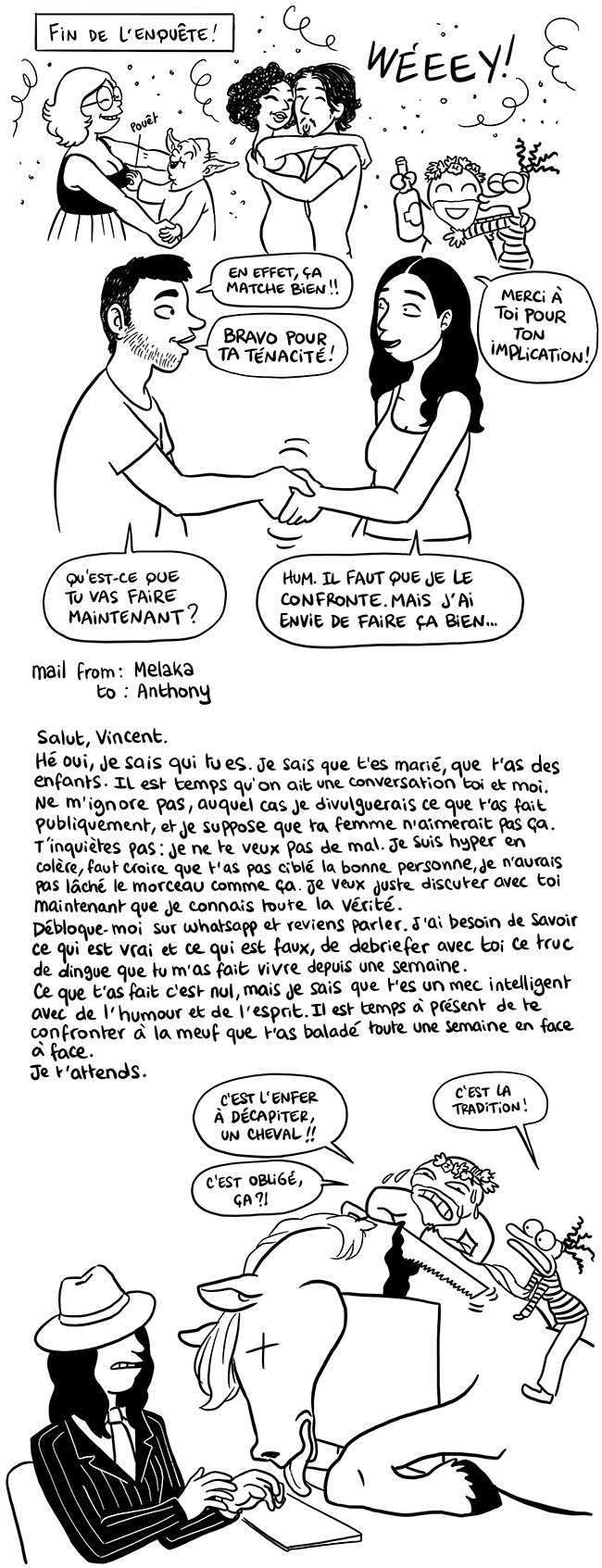 Je dois avouer que ça me soulage d’arriver à la fin de mon histoire, qui aura duré pas loin d’un an. Je suppose que je raconterai encore ici certaines anecdotes liées à notre nouveau mode de vie, mais stop avec le bashing permanent que je me prends au visage, et avec le rythme et la pression infernaux que je me suis imposée avec tout ça. Oui j’en ferai sûrement un bouquin, oui, j’aurai besoin d’énormément remanier le contenu, ajouter des passages, réécrire d’autres moments… avec un peu de recul. Raconter tout ça alors que tout était si frais, en impro semaine après semaine ne m’a pas aidé à avoir une cohérence globale, même si la formule « témoignage, collection d’anecdotes liées au chemin tumultueux, + mon catfish » a eu l’air de plutôt bien marcher (le côté cliffhanger hebdomadaire a bien aidé cependant), et donne un côté « sur le vif » pas désagréable pour ce type de projet. Même si au final, ce projet ne parle pas tant de libido ou de polyamour que de « Mélaka découvre le monde merveilleux des applis de rencontre ». Sans doute que pour une version papier, je réengloberai tout ça dans un propos plus analytique, plus détaché et plus global autour du polyamour. Tout ce que je peux vous dire – avant l’épilogue de la semaine prochaine – c’est que ce chemin que nous parcourons, mon chéri et moi, on a continué à le parcourir, qu’on n’est plus du tout dans les situations décrites dans la bd, qu’on est heureux, qu’on s’aime, et qu’on mesure chaque jour la chance monumentale qu’on a de pouvoir vivre des choses formidables avec des gens formidables (qui se reconnaîtront ;)) sans pour autant remettre quoi que ce soit de notre vie conjugale et familiale en question. Que même si le bateau a tangué, il s’est sacrément stabilisé depuis, et qu’on en tire lui et moi un bonheur immense !…
