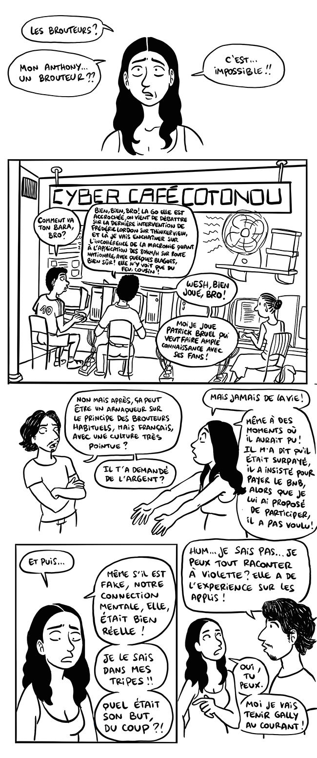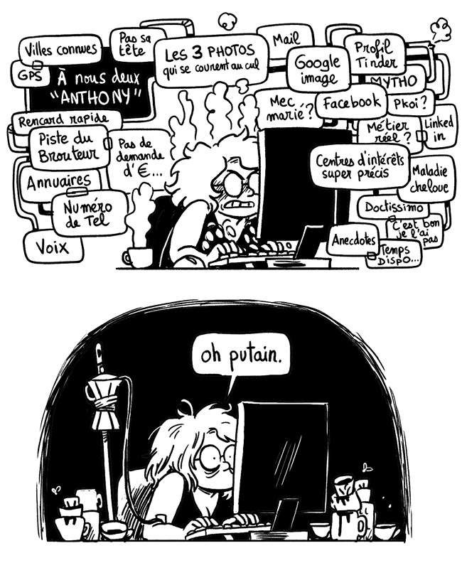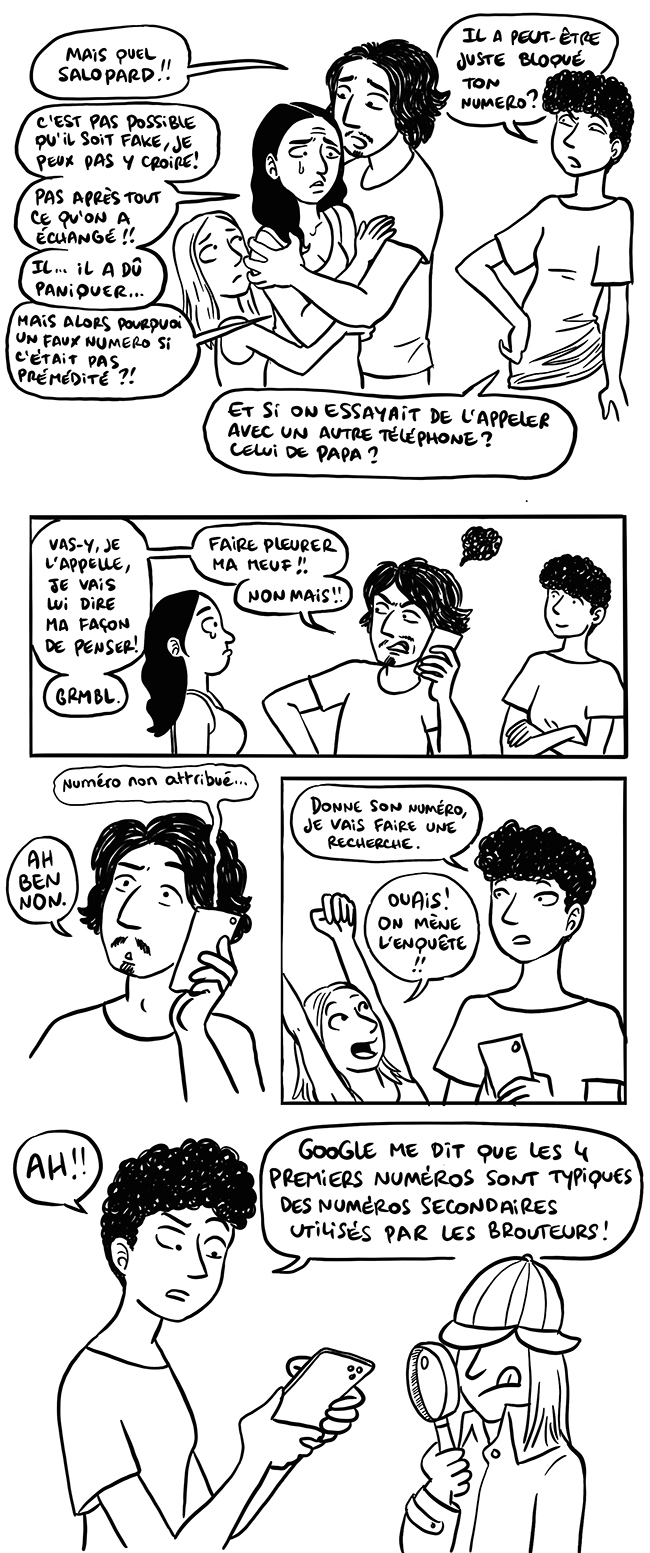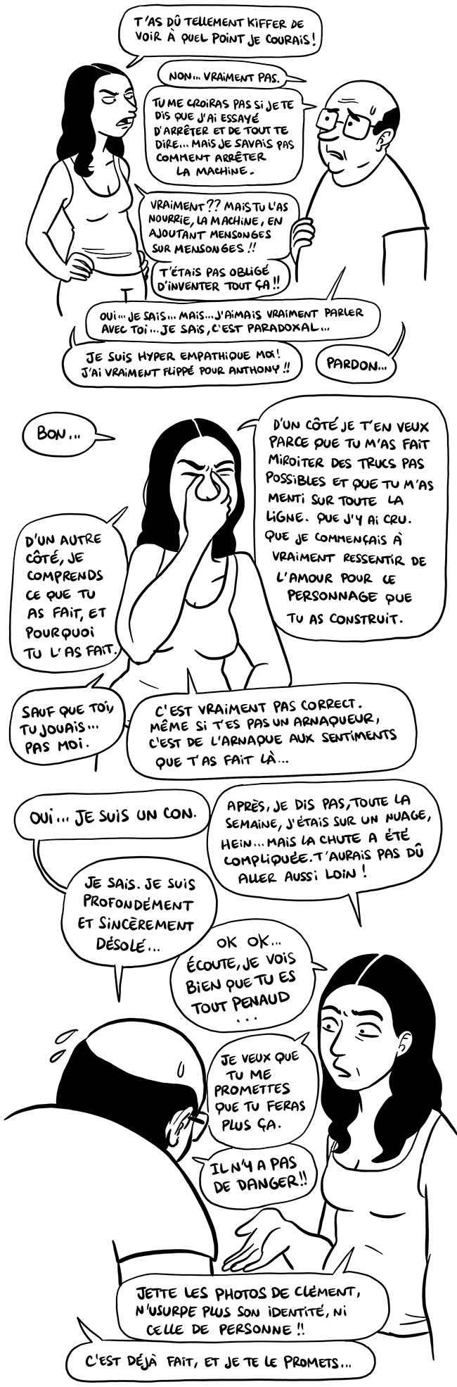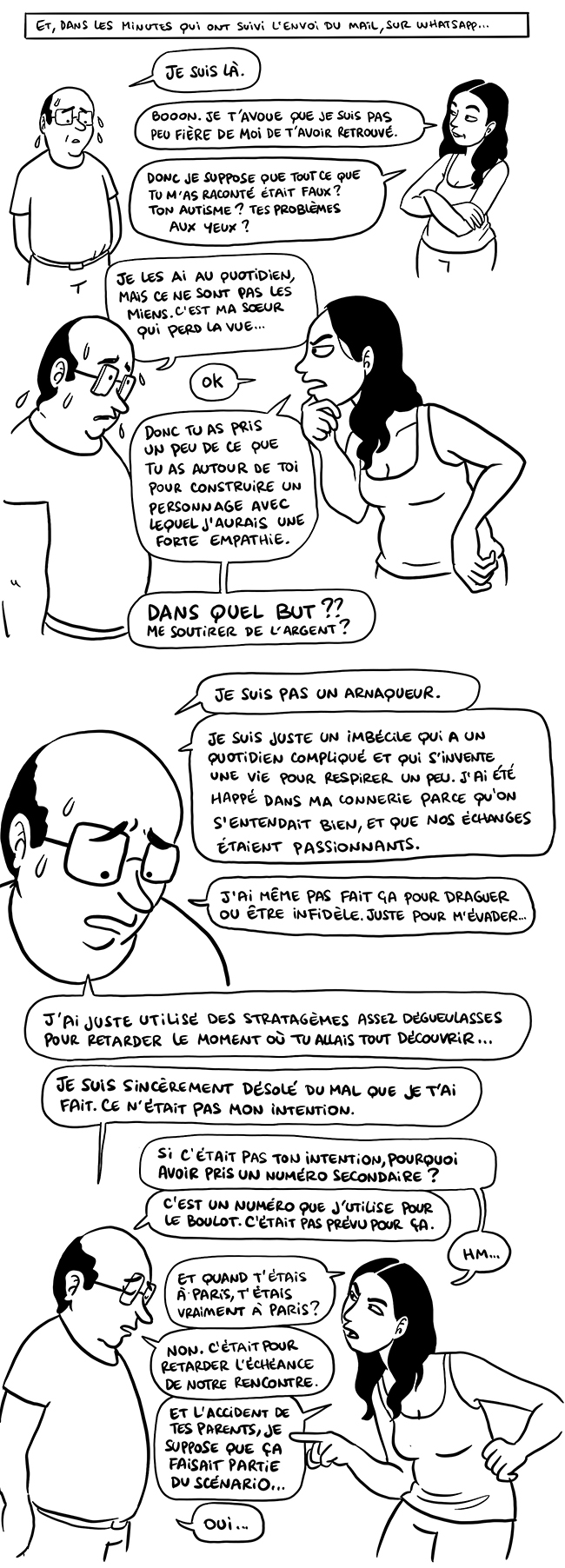 Je dois avouer que ça me soulage d’arriver à la fin de mon histoire, qui aura duré pas loin d’un an. Je suppose que je raconterai encore ici certaines anecdotes liées à notre nouveau mode de vie, mais stop avec le bashing permanent que je me prends au visage, et avec le rythme et la pression infernaux que je me suis imposée avec tout ça. Oui j’en ferai sûrement un bouquin, oui, j’aurai besoin d’énormément remanier le contenu, ajouter des passages, réécrire d’autres moments… avec un peu de recul. Raconter tout ça alors que tout était si frais, en impro semaine après semaine ne m’a pas aidé à avoir une cohérence globale, même si la formule « témoignage, collection d’anecdotes liées au chemin tumultueux, + mon catfish » a eu l’air de plutôt bien marcher (le côté cliffhanger hebdomadaire a bien aidé cependant), et donne un côté « sur le vif » pas désagréable pour ce type de projet. Même si au final, ce projet ne parle pas tant de libido ou de polyamour que de « Mélaka découvre le monde merveilleux des applis de rencontre ». Sans doute que pour une version papier, je réengloberai tout ça dans un propos plus analytique, plus détaché et plus global autour du polyamour. Tout ce que je peux vous dire – avant l’épilogue de la semaine prochaine – c’est que ce chemin que nous parcourons, mon chéri et moi, on a continué à le parcourir, qu’on n’est plus du tout dans les situations décrites dans la bd, qu’on est heureux, qu’on s’aime, et qu’on mesure chaque jour la chance monumentale qu’on a de pouvoir vivre des choses formidables avec des gens formidables (qui se reconnaîtront ;)) sans pour autant remettre quoi que ce soit de notre vie conjugale et familiale en question. Que même si le bateau a tangué, il s’est sacrément stabilisé depuis, et qu’on en tire lui et moi un bonheur immense !…
