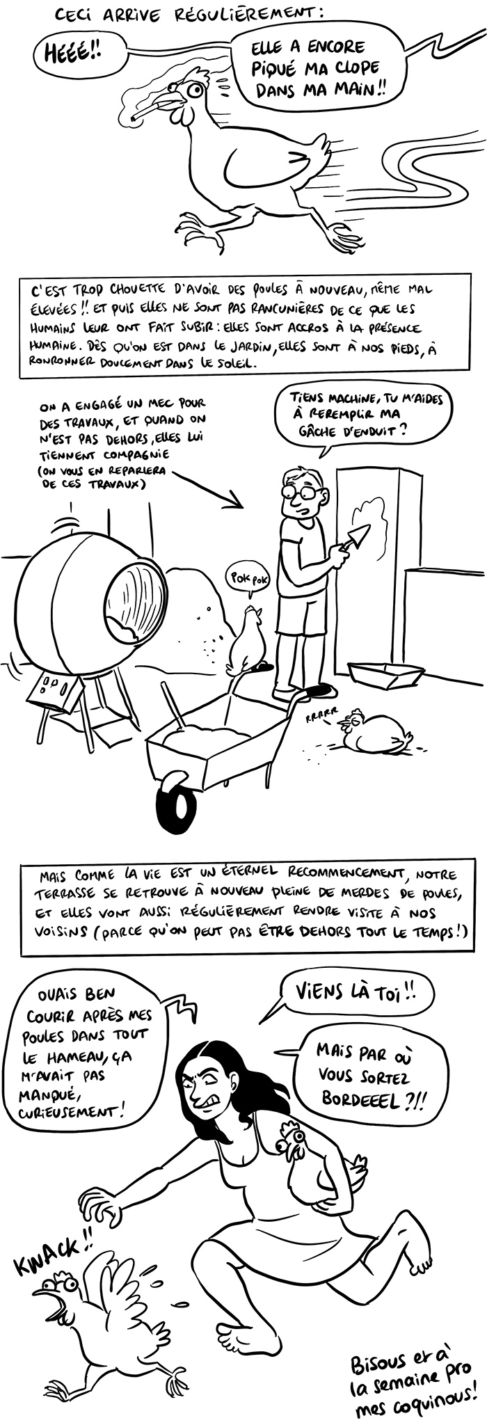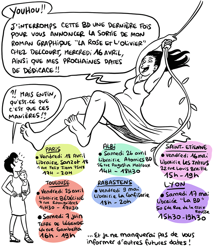 Voilà, on arrive à la fin de ce récit, il me reste encore un épisode – l’épilogue – à dessiner. Ma semaine va être très remplie, je ne suis pas certaine que j’aurai le temps de le faire pour lundi prochain ; D’ailleurs, vendredi 16 je serai en dédicace à Saint-Etienne de 15 à 19h à la librairie Les Intrus, et samedi 17, retrouvez moi à Lyon à « La Bande-Dessinée » de 15h30 à 19h30 !