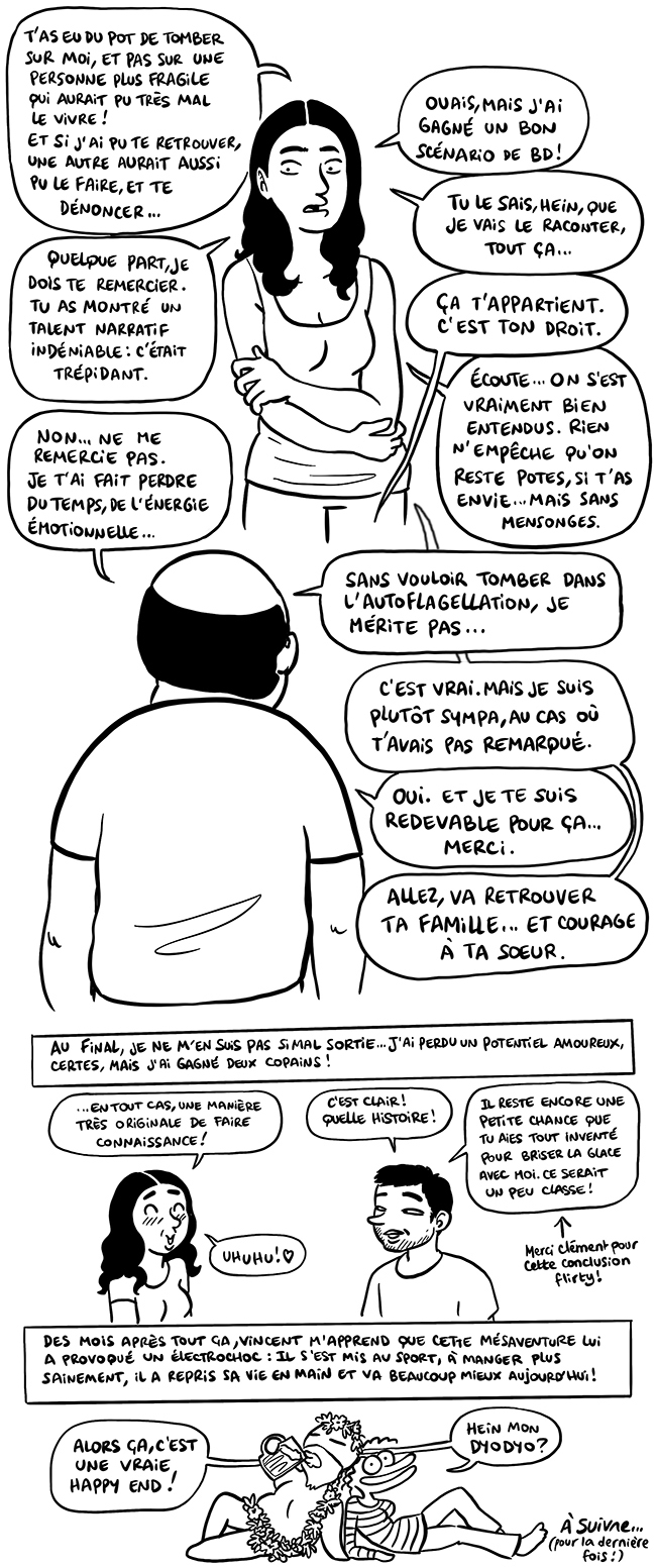 Merci à toustes d’avoir suivi nos aventures, merci à celleux qui ont laissé des commentaires, ceux-ci étaient aussi passionnants à suivre que l’histoire en elle même je pense. Si je finis par faire un bouquin de tout ça, ce sera avec beaucoup d’inédits, et il faudra que je trouve un moyen d’intégrer certains commentaires à l’histoire… Je me laisse un temps de réflexion, pour prendre aussi un peu de recul. Et à propos de re-cul, ça me fait du bien aussi de savoir que je vais enfin pouvoir vivre mes trucs sans forcément m’exposer à vos jugements ahahaha