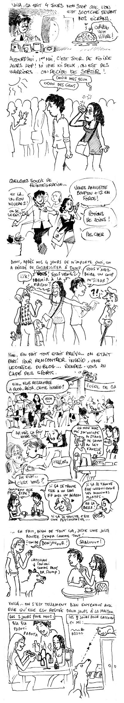 À préciser tout de même, parce qu’on s’en rend pas compte dans cette petite bd, que l’animal est vraiment hyper tendre avec les humains, elle nous suit partout, elle est en demande affective énorme. Le seul problème c’est que cette demande affective est exclusive et qu’elle a l’air de ne pas accepter qu’un autre chat, Mi en l’occurence, qui etait là bien avant elle, ne partage cet amour avec elle. Je pense qu’elle n’a pas été bien sevrée et allez savoir ce qu’elle a vécu dans la rue, en tout cas elle a vraiment besoin de se faire adopter et elle est craquante. Dès que mon appareil photo est rechargé, je mets une photo en ligne pour que vous voyiez la bête. Je suis donc ouverte à toute proposition, mais, en attendant, elle va rester à la maison, je vous tiendrai au courant de l’évolution des rapports entre les deux chats.. J’aimerai juste, s’il y a moyen, que la petite ait trouvé un maître aimant pour l’arrivée de la nouvelle, qui va être toute pitite et fragile. La situation risque de s’envenimer si d’ici là la « rescapée » n’a pas trouvé preneur…